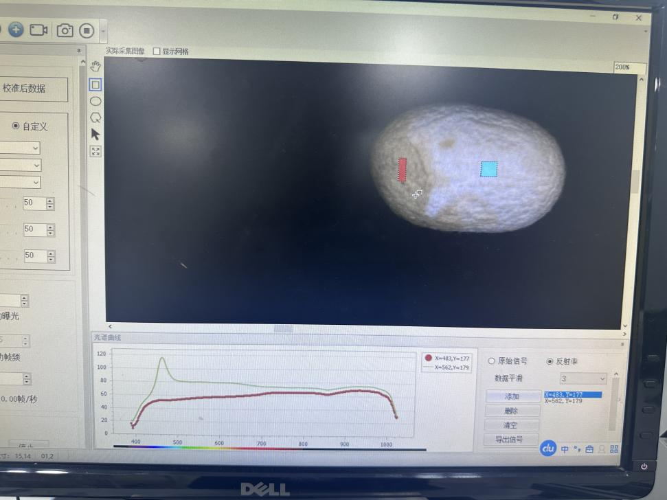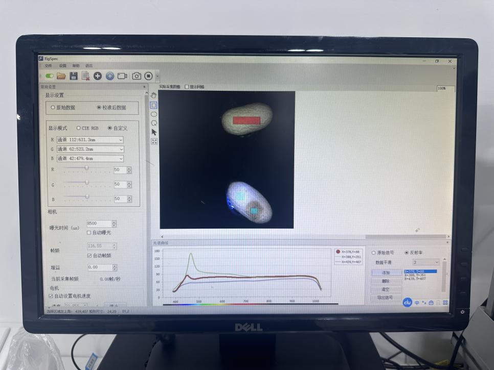 400-1000nm下拍攝結果,可以看到內部蟲體死亡的狀態(tài)下,會緊緊貼著內壁,在燈光照射下,很清晰的就能看到,而正常的蠶繭,則蟲體在內部可以四處晃動,燈光照射無法顯現(xiàn)。通過選擇不同區(qū)域,正常的和黑色區(qū)域,也可以看到其反射光譜曲線有存在差異,400-500納米區(qū)間,無黑斑的地方反射率明顯高一部分,通過后期數(shù)據(jù)建模,可以有效進行分別,并且通過面積計算,也可以更精確的判斷出所占比面積,能更細化的分別。