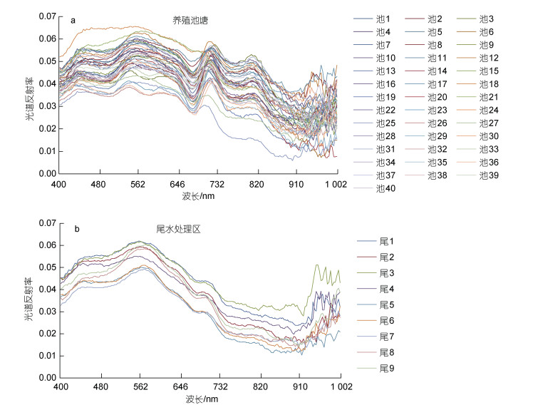 研究養殖小區共49個采樣點的光譜反射率曲線如所示, 其中圖列出了40個養殖池塘采樣點的反射率曲線,列出了9個尾水區采樣點的反射率曲線。可以看出池塘水體的光譜特征在400~ 560 nm范圍內, 光譜反射率呈上升趨勢, 至560~ 580 nm附近形成一個反射高峰, 這主要是是由水體中葉綠素和胡蘿卜素在此波段具有較弱的吸收特點, 同時加上藻類和懸浮物的散射作用而引起反射高峰。而到580 nm后, 反射率曲線呈下降趨勢, 直至680~710 nm處附近則形成一個峰谷, 主要是由于水體中的葉綠素a在此波段具有強吸收的特點); 而緊接著在790~810 nm范圍內形成一個峰值, 主要是由于水中懸浮物的散射作用。而尾水處理區由于經過過濾、沉淀、曝氣等凈化過程, 水體中懸浮物和藻類去除率可達到70%以上, 因此, 尾水處理區在680~710 nm和790~810 nm范圍內均未形成明星的峰值, 而其他波段的變化規律和養殖池塘具有一致性。綜合分析光譜曲線可知, 不同池塘水體的光譜曲線變化趨勢總體一致, 但是由于不同采樣點具有不同的水質指標濃度, 導致其峰谷值及曲線高低變換存在一定差異。
